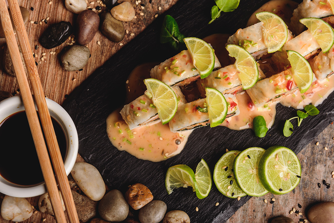 Salmon tempura, palta , envuelto en queso crema y ciboulette