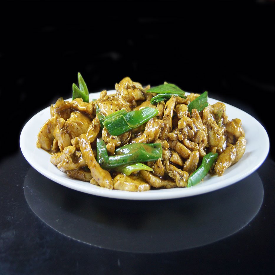 Trozos de pollo salteado con salsa de porotos negros y ajo.
