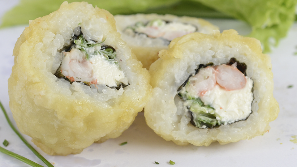 camarón, queso crema, salmón envuelto en tempura o pollo tempura